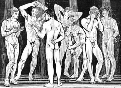 Wittdorf, Jürgen: Unter der Dusche, 1964, Holzschnitt. Handabreibung auf Japanpapier, Blatt 97 x 70 cm, signiert Wittdorf 61, II. Auflage (nur 12 Stück). Aus "Zyklus für die Jugend".