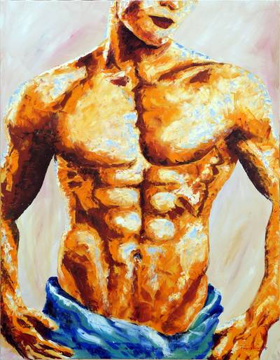 Krüger, Frank: Desnudo X, Beachvolleyballer, 2006, Acryl auf Leinwand. 116 x 89cm. Der Maler lebt und arbeitet auf Mallorca, hat aber mit der Galeria Frank Krüger auch noch eine Dependance in Berlin im Hilton Hotel am Gendarmenmarkt.