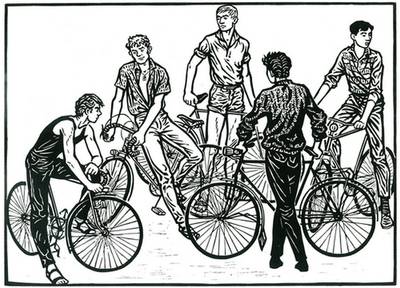 Wittdorf, Jürgen: Gruppe auf Rädern, 1961, Holzschnitt. Handabreibung auf Japanpapier, Blatt 97 x 70 cm, signiert Wittdorf 61, II. Auflage (nur 12 Stück). Aus "Zyklus für die Jugend".