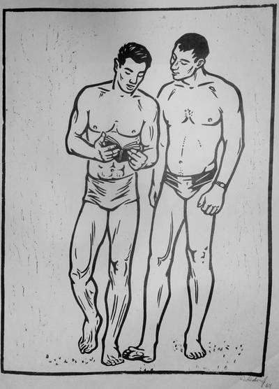 Wittdorf, Jürgen: Trainingsgespräch oder Sommerlicher Literaturspaziergang (zwei Männer mit Buch), 1964, Holzschnitt. Handabreibung auf Japanpapier, Blatt 82 x 63 cm, signiert Wittdorf 64. Auflage unbekannt.
