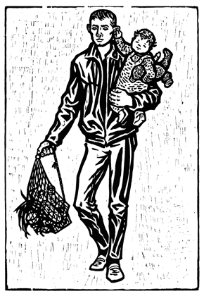 Wittdorf, Jürgen: Noch kein Bartwuchs und schon Vater, 1961, Holzschnitt. Handabreibung auf Japanpapier, Blatt 61 x 85 cm, signiert Wittdorf 61, Auflage unbekannt.